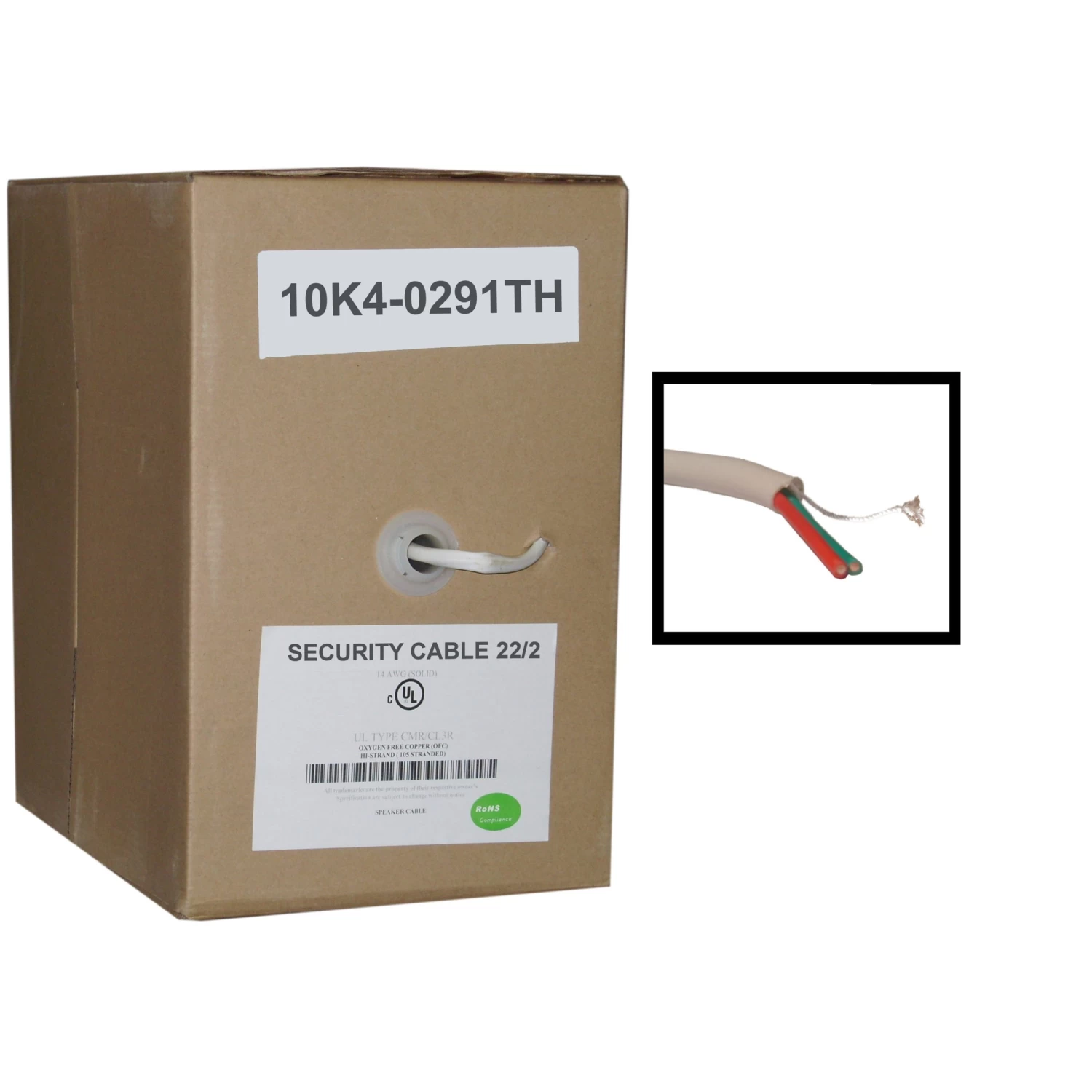 Our 1000 foot white 22 AWG (American Wire Gauge) 2 conductor solid security/alarm wire comes in easy to use pull boxes. This wire is CM / in-wall rated; it is not intended for plenum or riser situations.