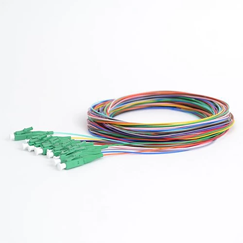 Manufactured with Corning fiber, this 900um pigtail features singlemode 12 Angled Physical Contact(APC) LC connectors and a 3-meter length. The 6 fibers are color coded to the industry standard: Blue, Orange, Green, Brown, Slate, White, Red, Black, Yellow, Violet, Rose, and Aqua. This pigtail is designed for use for high fiber count splicing applications. The green boot on this pigtail denotes a singlemode/APC cable.