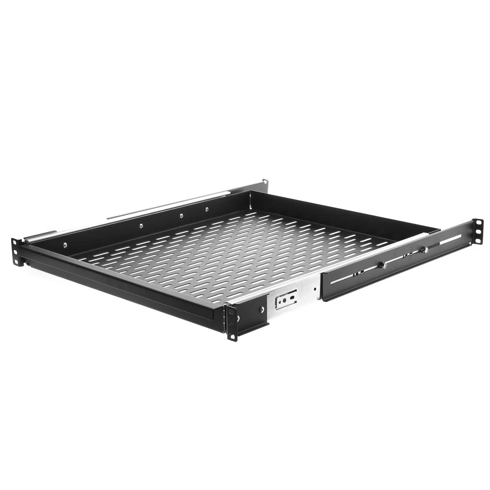 This heavy-duty 20-inch deep, 16.5-inch wide vented sliding rack shelf extends a nearly 18 inches out of the rack and allows for convenient access to all of your important network components – right when you need them. This sturdy shelf has a black powder coat and is vented to allow excellent air flow to your temperature-sensitive equipment. It features a built-in lip to makes for an easy-in, easy-out sliding motion that makes gaining access to your equipment easy. This simple-to-install rack has four mounting holds per U space, and can be used as a 1U drawer.