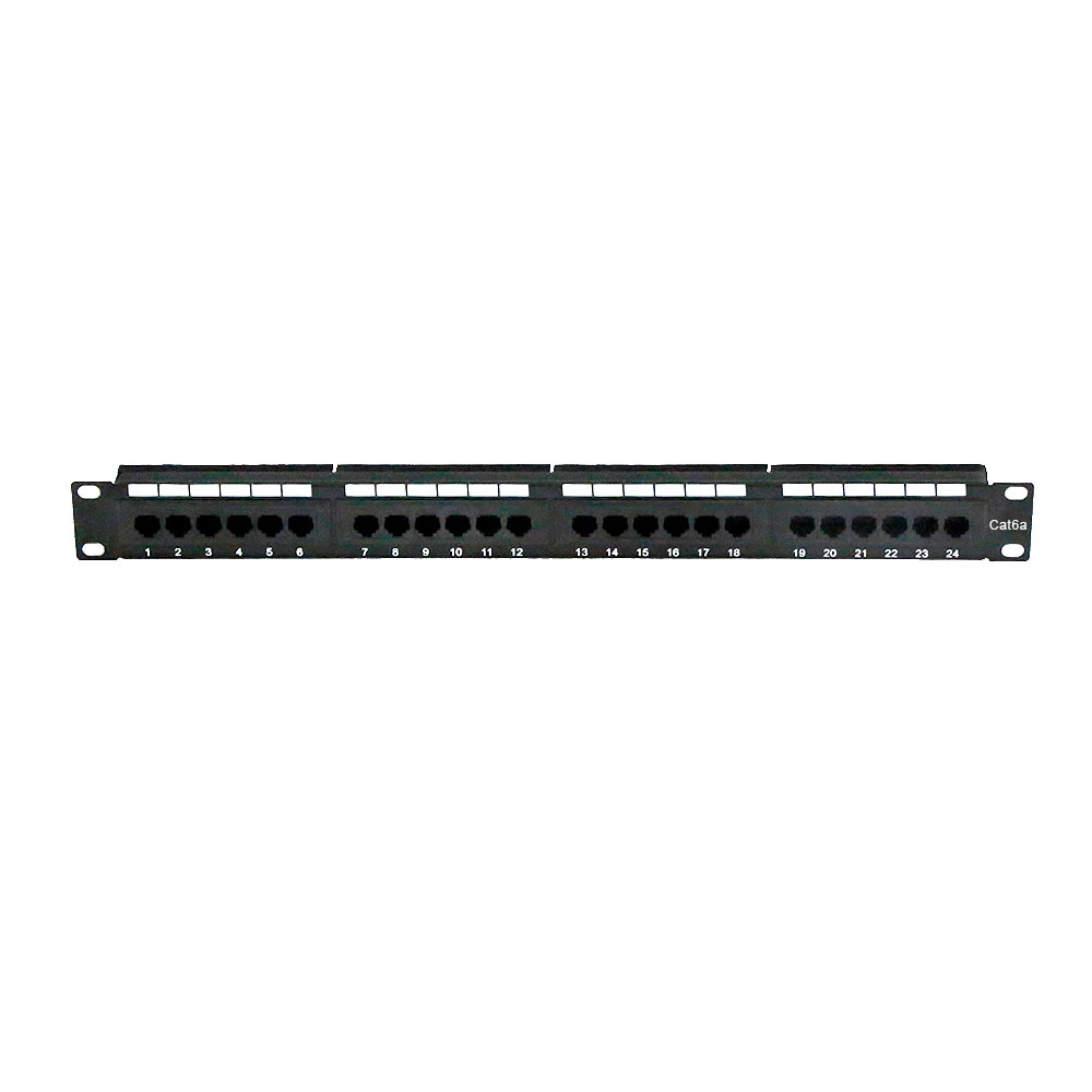 This 24 port Cat6a patch panel is used for building complex high-speed networks. The panel is of the 110 type and is compatible with the TIA/EIA 568A and 568B standards.