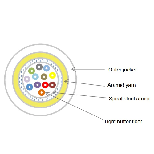 Our Steel Armored Fiber Optic Cable features Rodent Resistant Spiral Steel Armor, 12 strands of OM3 50/125um Multimode Corning® ClearCurve® Multimode core, and an aqua plenum rated jacket.