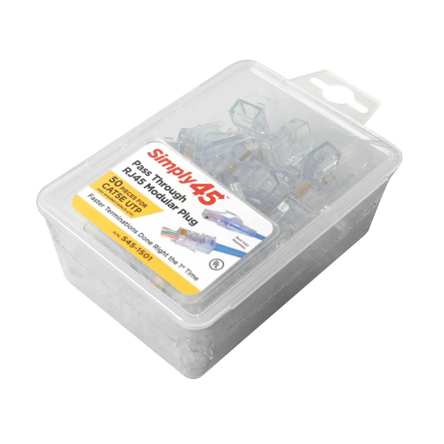 Simply45 RJ45 ends for Cat5e networking are used for crimping and terminating Gigabit Ethernet cables. These 8P8C connectors can be used for solid or stranded cable applications on internet and phone networks. Simply45 Cat5e crimp connectors have gold-plated contacts that give you a solid, corrosion-free connection for life. Ordering RJ45 connectors in bulk from CableWholesale means you will have enough to set up or modify your infrastructure. We have a full lifetime warranty on these cat5e tips with full support from our knowledgeable team.