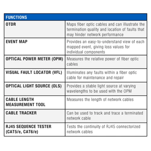 Includes 8 different functions for testing and evaluating fiber optic and network cables