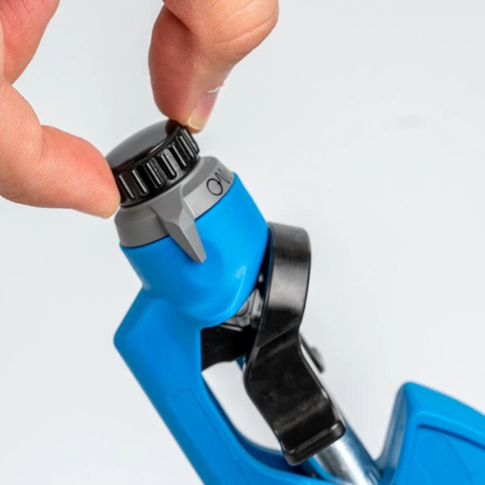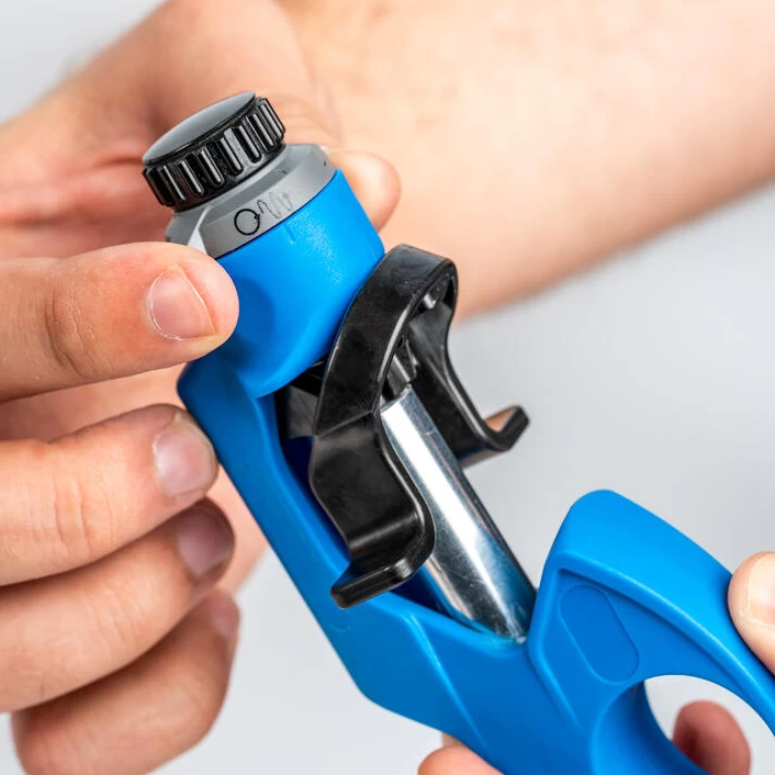 - Grey knob rotates blade for three different slitting options: ring, spiral, or longitudinal