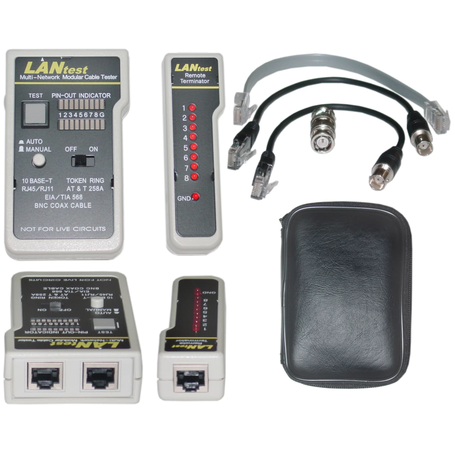 The Lan Tester Network Cable tester Pin Configuration with Wire Map Results is capable of reading the pin configurations of 10 Base-T Cat5 cables, 10 Base-2 Coax, RJ45/RJ11 modular cables, 356A, TIA-568 A/568B and Token Ring cables by comparing one transmitting end to the corresponding receiving end. It can also test for open circuits, wire shorts and cable continuity. The remote kit can test cables that are on a patch panel or wall plate as well as be able to test cables from a distance.