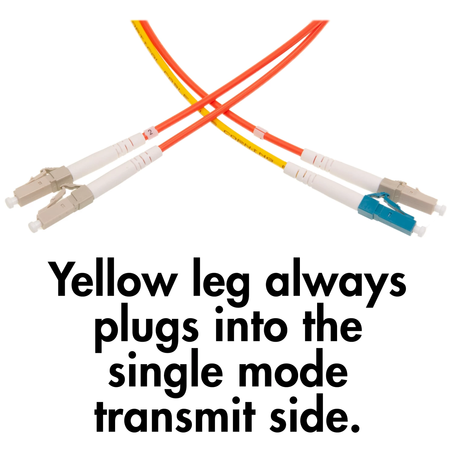 This 1-meter 50/125 mode conditioning fiber optic patch cable allows Gigabit 1000 Base-LX and 10GBASE–LRM routers and switches to be installed into existing multimode cable plants. This particular cable uses duplex LC connectors on the singlemode side and duplex LC connectors on the multimode side. The single mode leg is marked by a yellow jacket, this leg should always be plugged into the transmit of the single mode device in order for the connection to function.