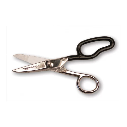 Among our platinum tools, professional electrician scissors are ideal for electrical, telephone and datacom projects and applications. These platinum tool professional electrician scissors easily cut 12 AWG stranded wire, 16 AWG solid wire, and kevlar such as that found in fiber optic cable. The blade is notched for stripping 19 to 23 AWG wire and features a serrated edge for cleaning binding posts and wire.