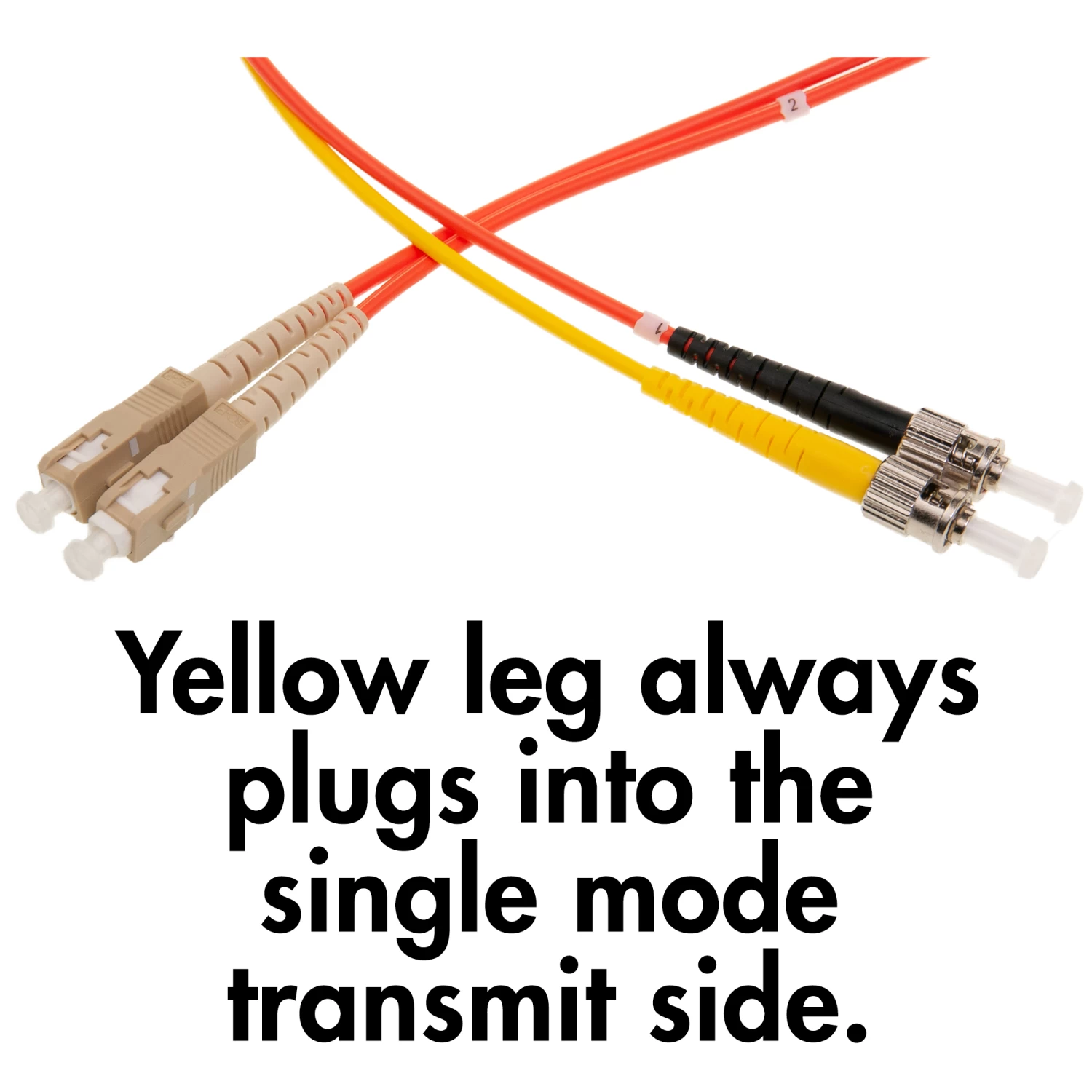 This 1-meter 50/125 mode conditioning fiber optic patch cable allows Gigabit 1000 Base-LX and 10GBASE-LRM routers and switches to be installed into existing multimode cable plants. This particular cable uses duplex ST connectors on the singlemode side and duplex SC connectors on the multimode side. The single mode leg is marked by a yellow jacket, this leg should always be plugged into the transmit of the single mode device in order for the connection to function.