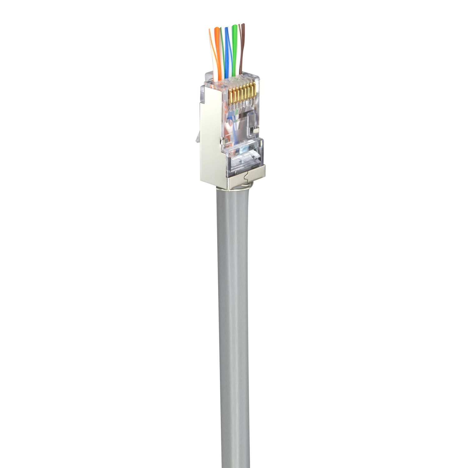 The individual wires go all the way through this connector head and allow you to make sure everything is lined up before you crimp down. The unique internal design of the S45-1550 pass-through RJ45 modular plug allows the LAN cable to be inserted further into the RJ45 plug. This reduces the length of untwisted wires improving NEXT performance..