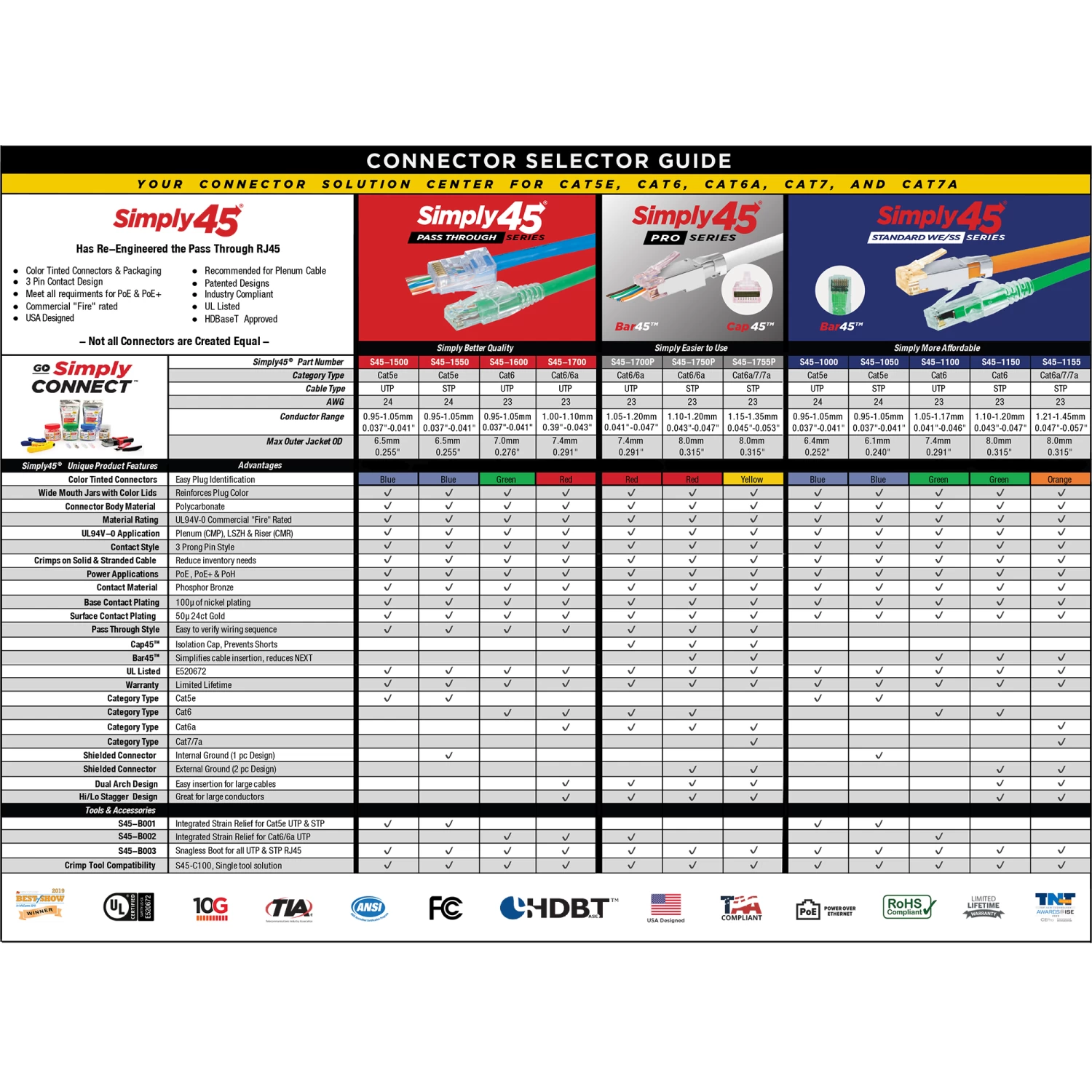 Simply45 RJ45 ends for Cat6a/7/7a networking are used for crimping and terminating Gigabit Ethernet cables. These 8P8C connectors can be used for solid or stranded cable applications on internet and phone networks. Simply45 Cat6/7/7a crimp connectors have gold-plated contacts that give you a solid, corrosion-free connection for life. Ordering RJ45 connectors in bulk from CableWholesale means you will have enough to set up or modify your infrastructure. We have a full lifetime warranty on these cat6a/7/7a tips with full support from our knowledgeable team.