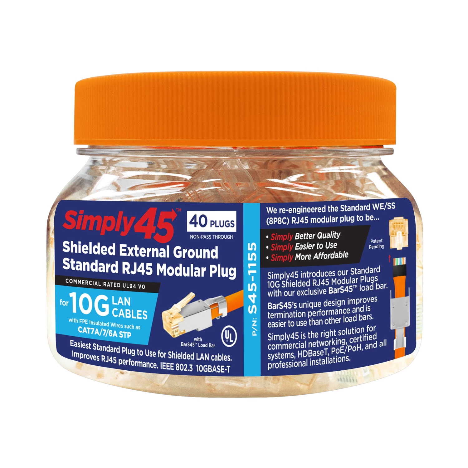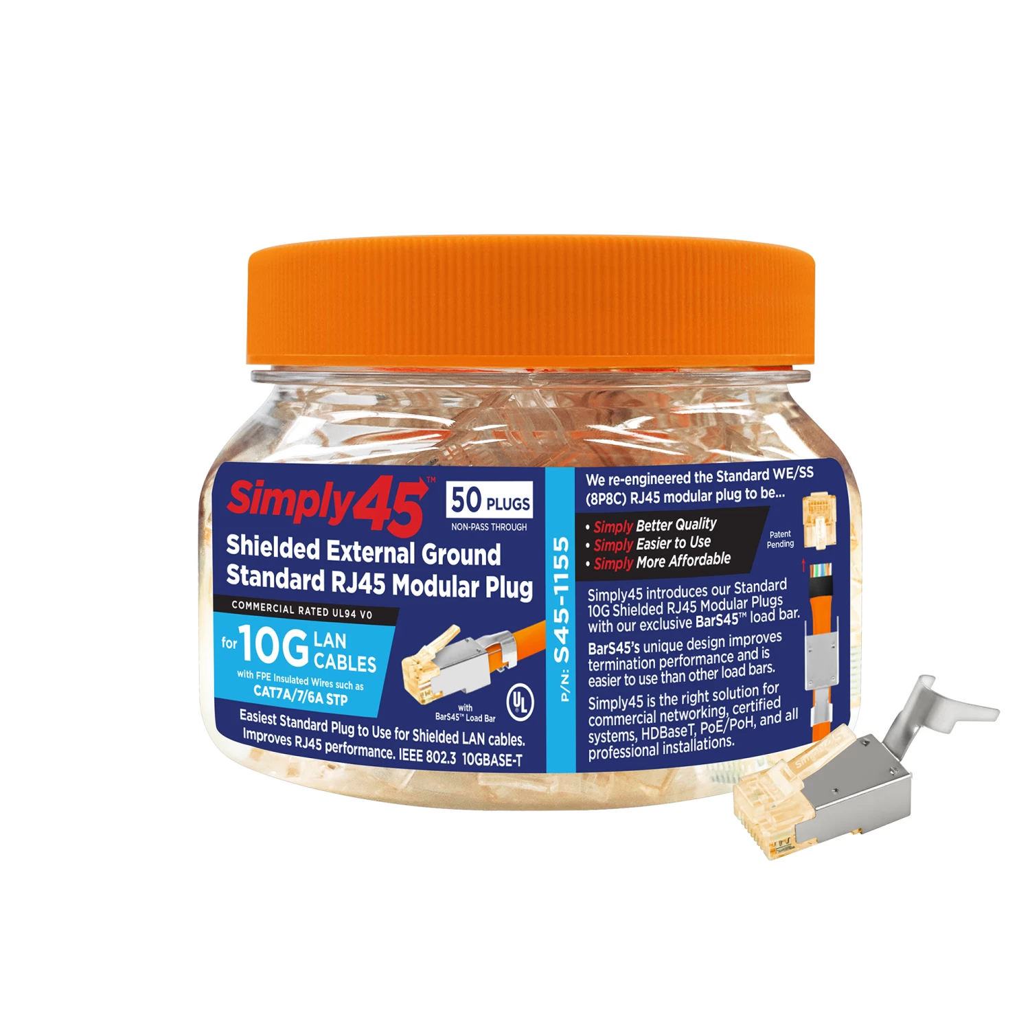 The orange tint of the RJ45 plug helps you easily identify this as a cat6a/7/7a mod plug. The wide mouth jar allows even the largest hand to easily remove plugs to get the termination done quickly and easily. This 2-piece STP rj45 comes with the Bar45 Hi/Lo stagger load bar The Bar45 load bar improves performance by reducing the effects of crosstalk inside the rj45 plug. Bar45 limits both near-end crosstalk(NEXT) and far-end crosstalk(FEXT). Bar45 reduces the length of untwisted wires inside the plug.